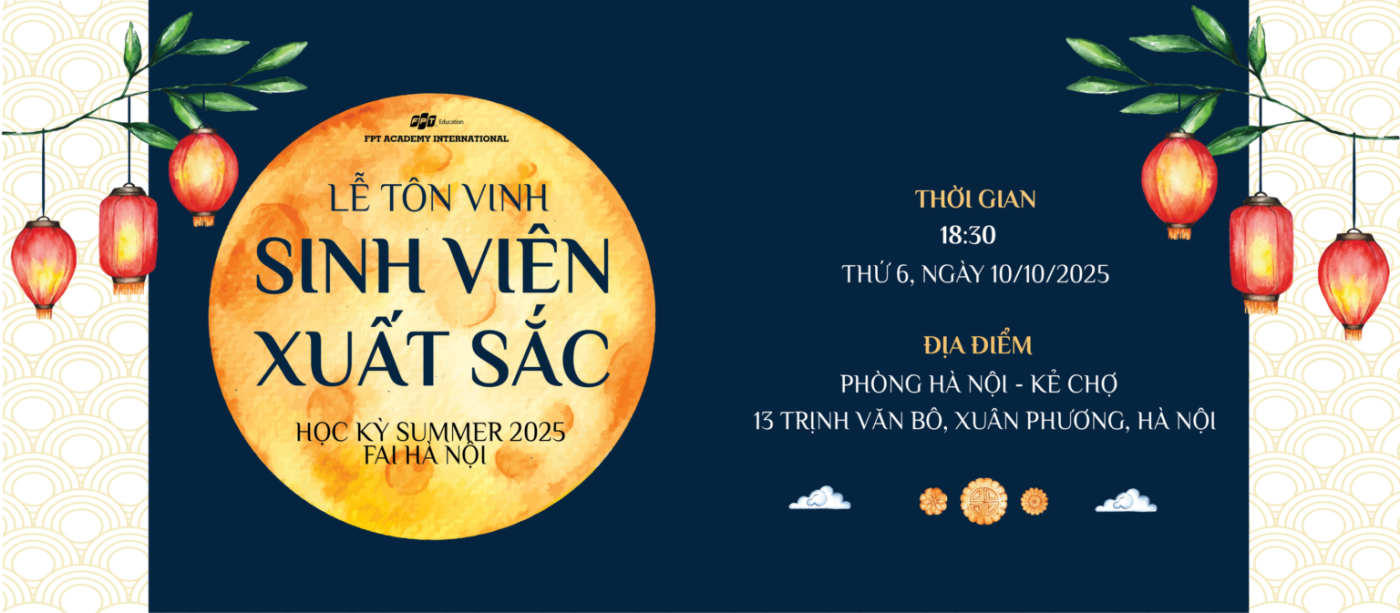 Viện Đào tạo Quốc tế FPT (FAI) tại Hà Nội (gồm FPT Aptech, FPT Arena Multimedia, FPT Jetking, FPT Skillking, Cranes FPT) chính thức tổ chức Lễ Tôn vinh Sinh viên Xuất sắc Học kỳ Summer 2025 để ghi nhận và vinh danh những cá nhân có thành tích nổi bật.