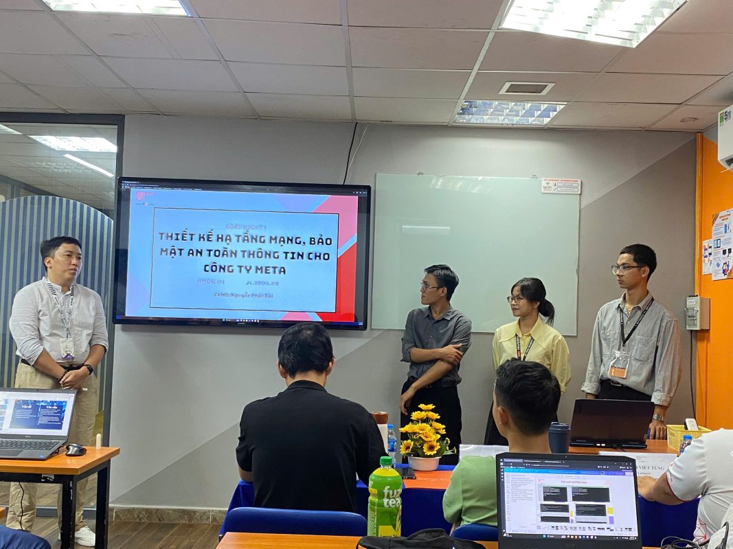Buổi bảo vệ đồ án là dịp để sinh viên tổng hợp và trình bày những kiến thức, kỹ năng đã học, đồng thời rèn luyện tư duy phản biện, khả năng thuyết trình và làm việc nhóm – những yếu tố quan trọng để thành công trong ngành công nghệ. Trong buổi bảo vệ, bốn nhóm sinh viên đã lần lượt giới thiệu các sản phẩm được đầu tư công phu, thể hiện sự hiểu biết chuyên sâu và tinh thần học hỏi nghiêm túc. Các đồ án tập trung vào việc thiết kế và triển khai hạ tầng mạng, tích hợp giải pháp bảo mật cho doanh nghiệp, tiêu biểu như hệ thống của Meta, D2Tech, TechSecure Việt Nam và TCHDgroup.