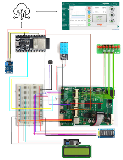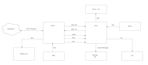 Hệ thống được kết nối ESP32 để gửi dữ liệu lên ThingsBoard, nhận lệnh điều khiển RPC và phản hồi lại cho FPGA. Giao diện hiển thị được xây dựng trực quan gồm LCD I2C, LED thanh 74HC595, LED 7 đoạn và dashboard realtime giúp hệ thống hoạt động ổn định liên tục.
